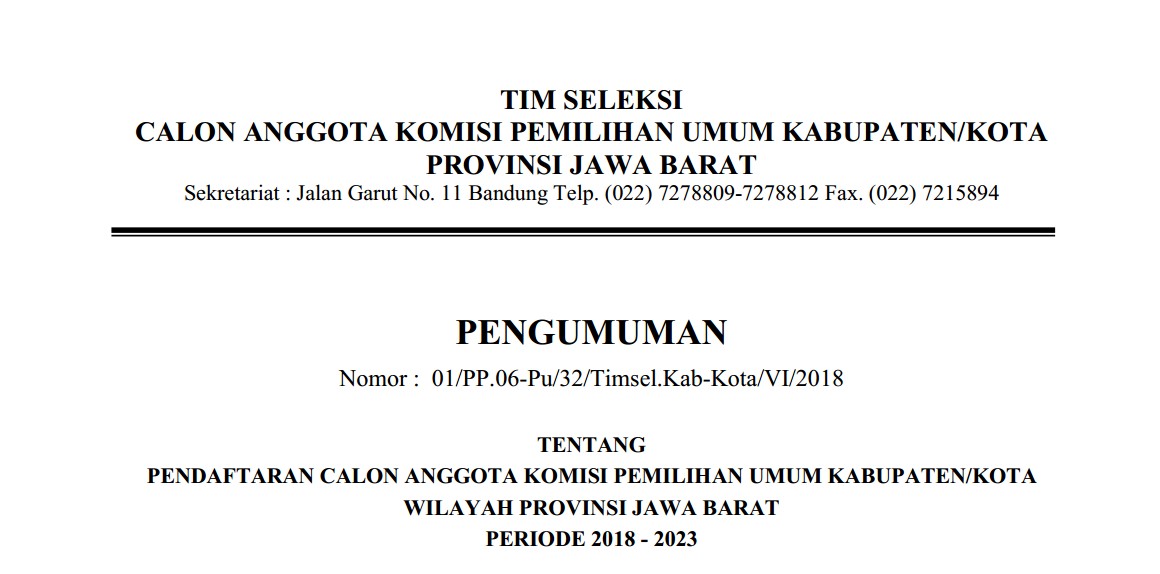 Pengumuman tentang pendaftaran calon anggota KPU Kabupaten/Kota di wilayah Jawa Barat Periode Tahun 2018 - 2023, selengkapnya dapat DIUNDUH DI SINI.