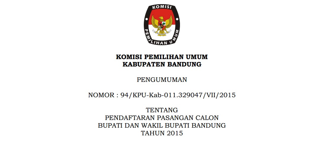 Pengumuman tentang pendaftaran pasangan calon Bupati dan Wakil Bupati Bandung Tahun 2015, selengkapnya dapat DIUNDUH DI SINI.