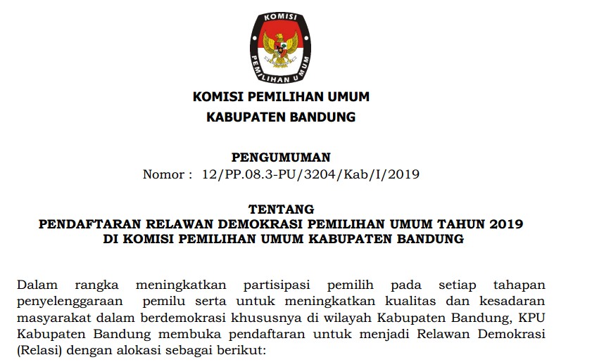 Pengumuman tentang pendaftaran Relawan Demokrasi pada Pemilu Tahun 2019, selengkapnya dapat DIUNDUH DI SINI.
