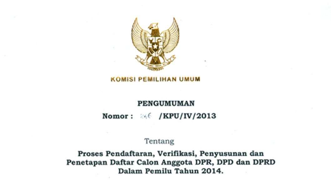 Pengumuman tentang proses pendaftaran, verifikasi, penyusunan, dan penetapan daftar calon anggota DPR, DPD, dan DPRD dalam Pemilu Tahun 2014, selengkapnya dapat DIUNDUH DI SINI.