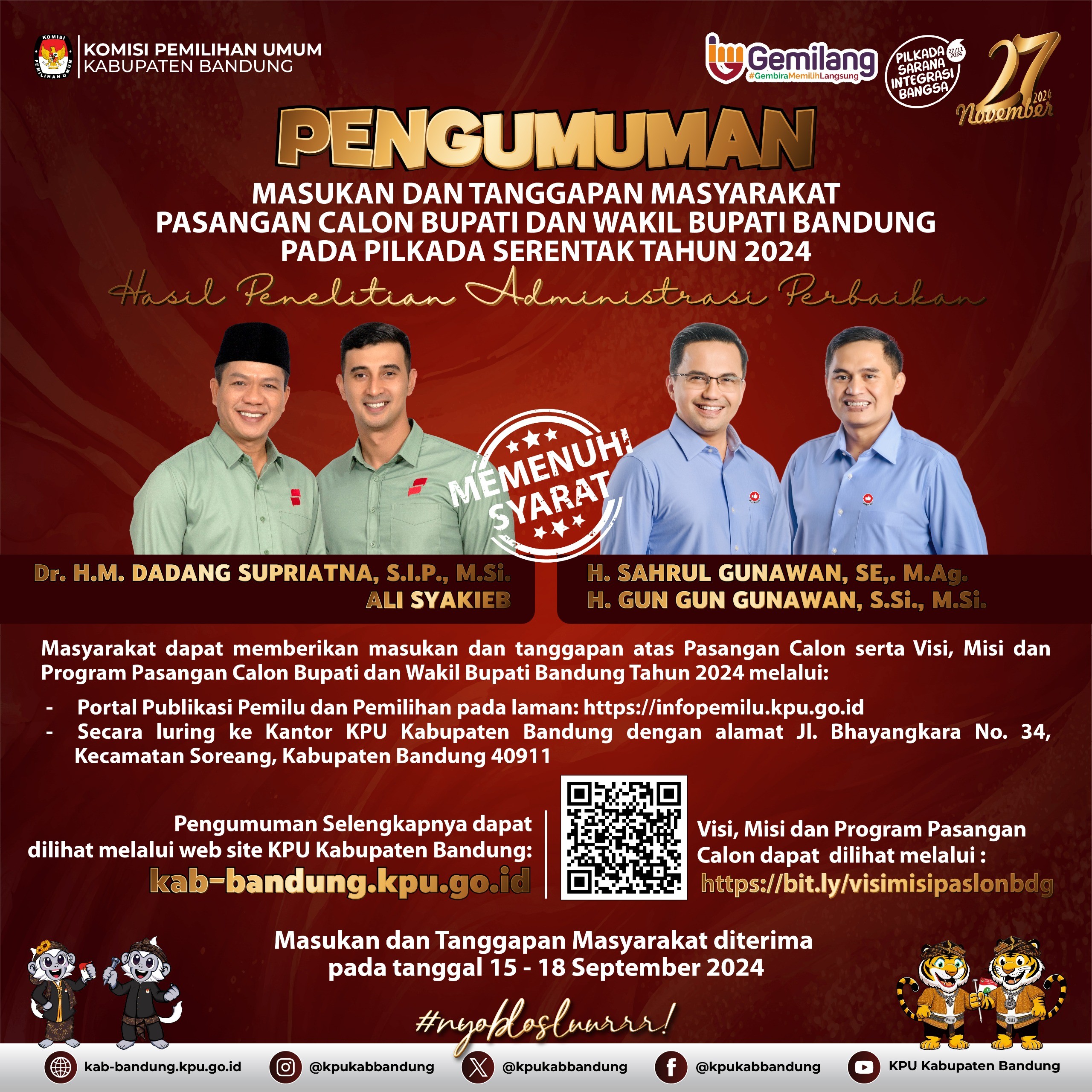 PENGUMUMAN PENERIMAAN MASUKAN DAN TANGGAPAN MASYARAKAT TERHADAP PASANGAN CALON BUPATI DAN WAKIL BUPATI BANDUNG TAHUN 2024