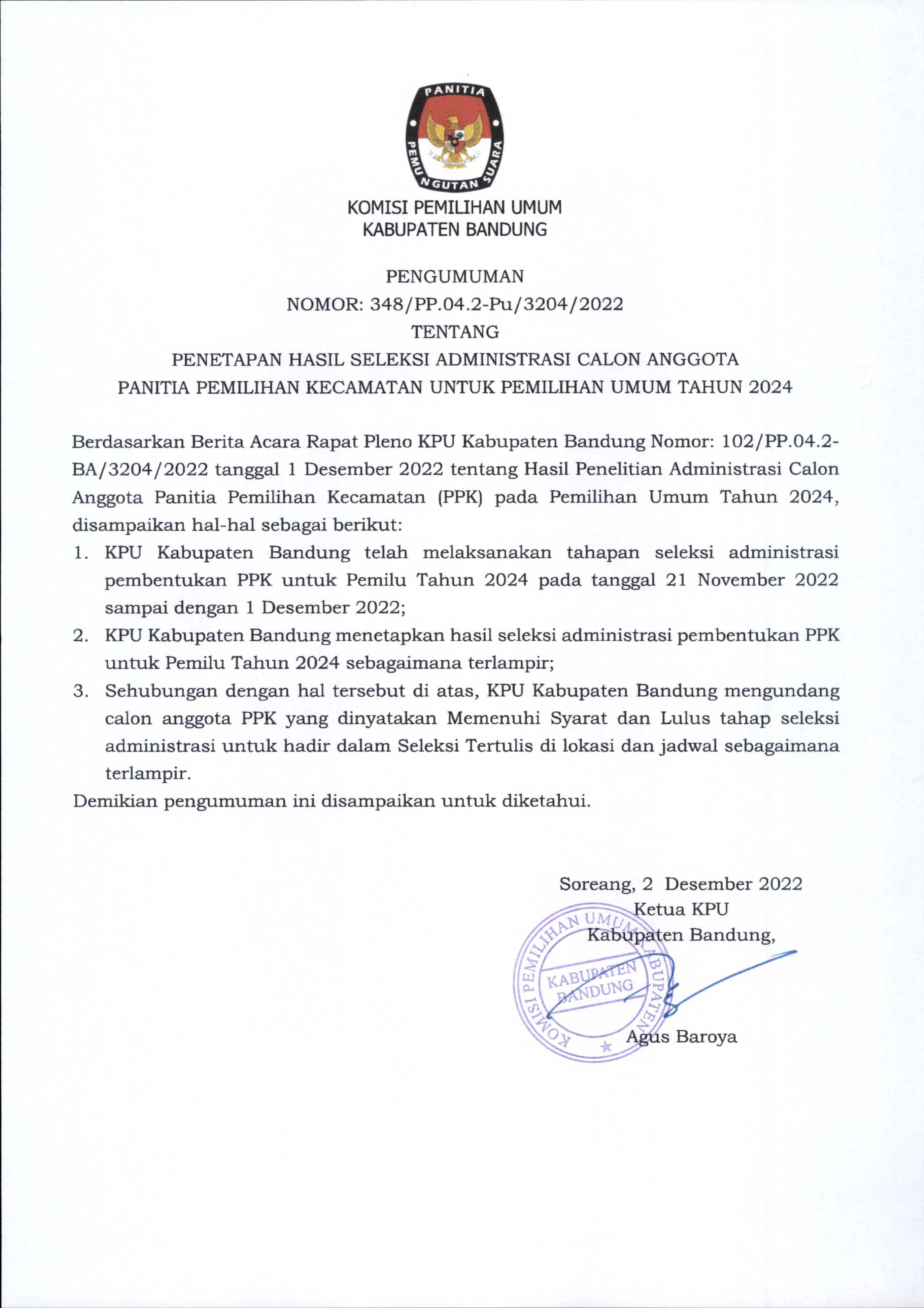 PENGUMUMAN PENETAPAN HASIL SELEKSI ADMINISTRASI CALON ANGGOTA PPK PEMILU TAHUN 2024