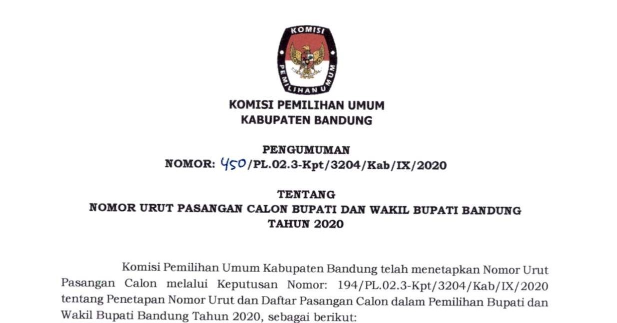 Pengumuman serta Salinan Keputusan tentang Penetapan Nomor Urut Pasangan Calon Bupati dan Wakil Bupati Bandung Tahun 2020, selengkapnya dapat DIUNDUH DI SINI