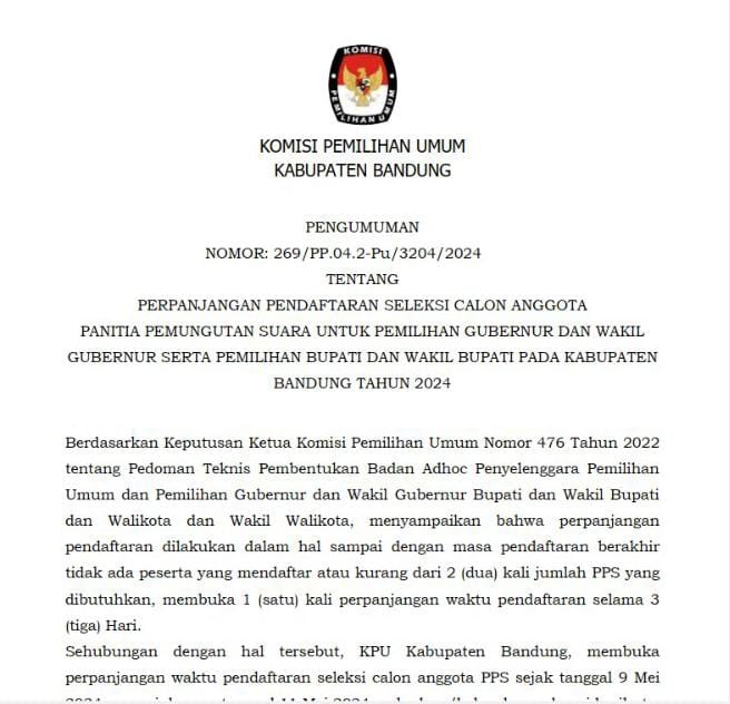 Sehubungan dengan hal tersebut, KPU Kabupaten Bandung, membuka perpanjangan waktu pendaftaran seleksi calon anggota PPS sejak tanggal 9 Mei 2024 sampai dengan tanggal 11 Mei 2024.