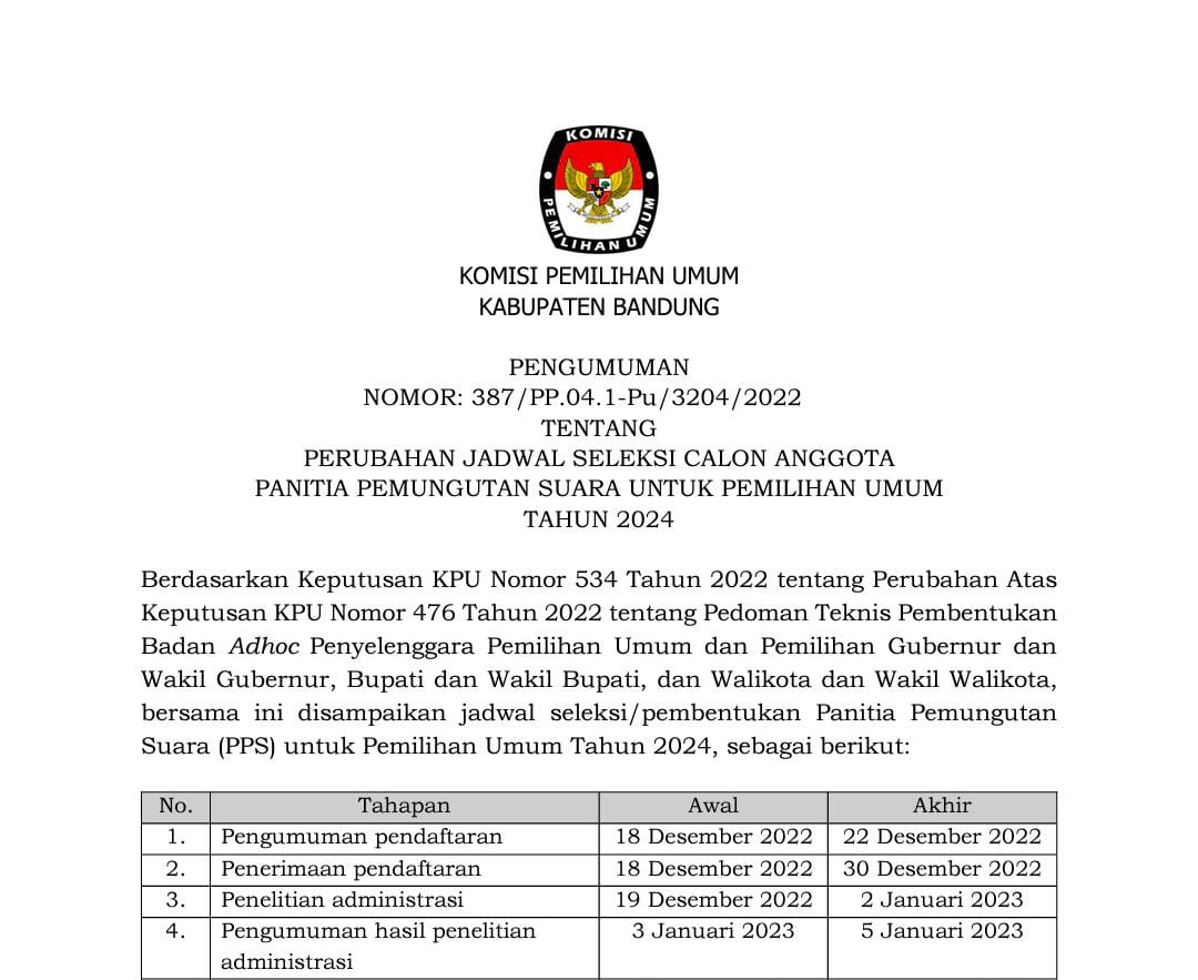 PENGUMUMAN PERUBAHAN JADWAL SELEKSI CALON ANGGOTA PPS UNTUK PEMILU 2024