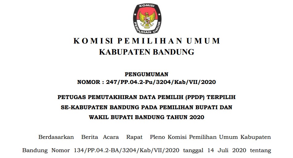 Pengumuman PPDP Terpilih pada Pemilihan Bupati dan Wakil Bupati Bandung Tahun 2020, selengkapnya dapat DIUNDUH DI SINI.