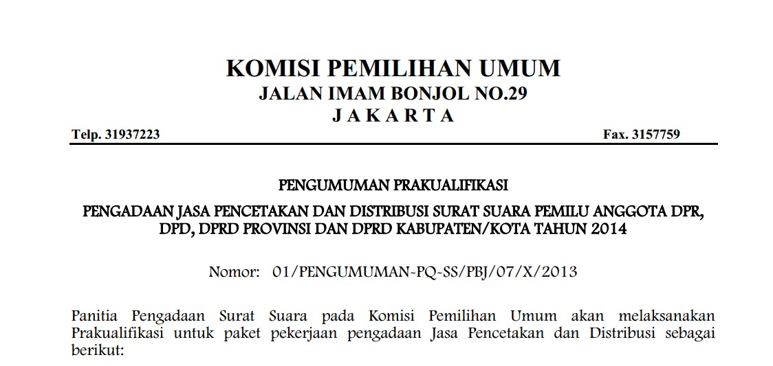 Pengumuman tentang prakualifikasi pengadaan jasa pencetakan dan distribusi surat suara Pemilu Anggota DPR, DPD, DPRD Provinsi dan DPRD Kabupaten/Kota Tahun 2014, selengkapnya dapat DIUNDUH DI SINI.