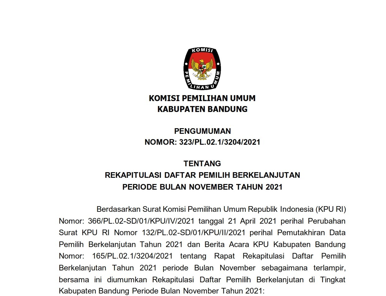 Pengumuman dan Berita Acara Rekapitulasi Daftar Pemilih Berkelanjutan (DPB) Periode Bulan November Tahun 2021 di Tingkat Kabupaten Bandung, selengkapnya dapat DIUNDUH DI SINI