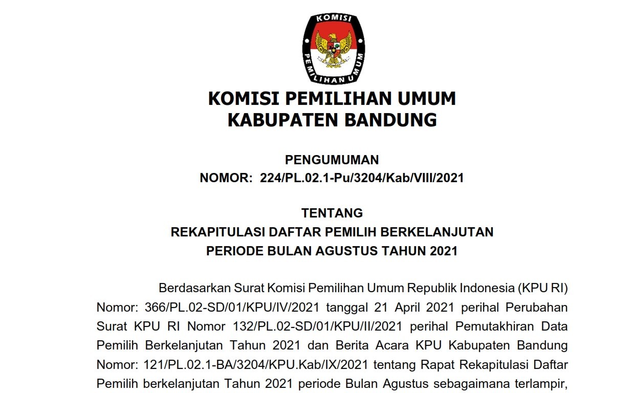 Pengumuman dan Berita Acara tentang Rekapitulasi Daftar Pemilih Berkelanjutan (DPB) Periode Bulan Agustus Tahun 2021 di Tingkat Kabupaten Bandung, selengkapnya dapat DIUNDUH DISINI