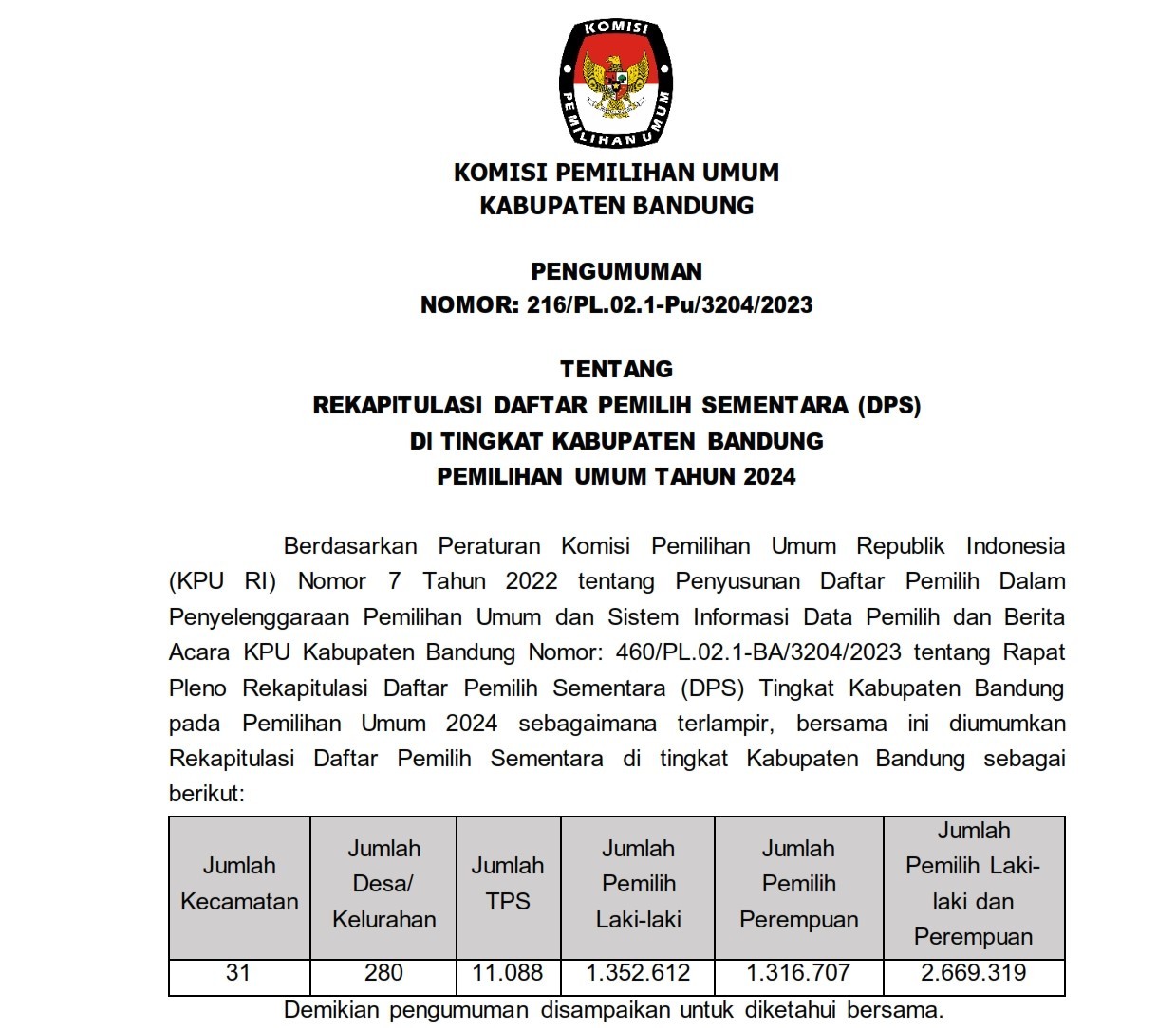 PENGUMUMAN REKAPITULASI DAFTAR PEMILIH SEMENTARA (DPS) DI TINGKAT KABUPATEN BANDUNG PADA PEMILU TAHUN 2024