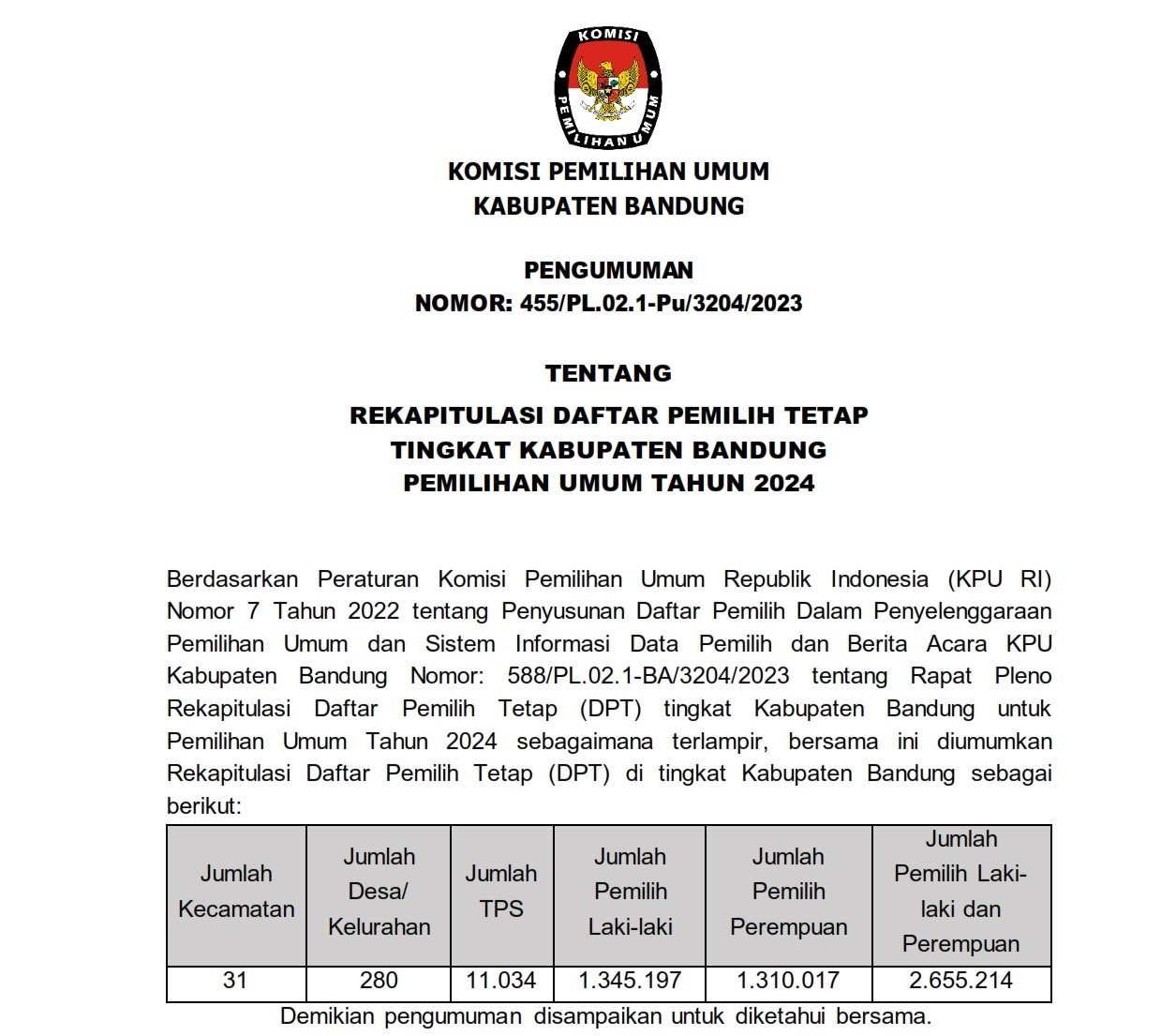 PENGUMUMAN REKAPITULASI DPT TINGKAT KABUPATEN BANDUNG PADA PEMILU 2024