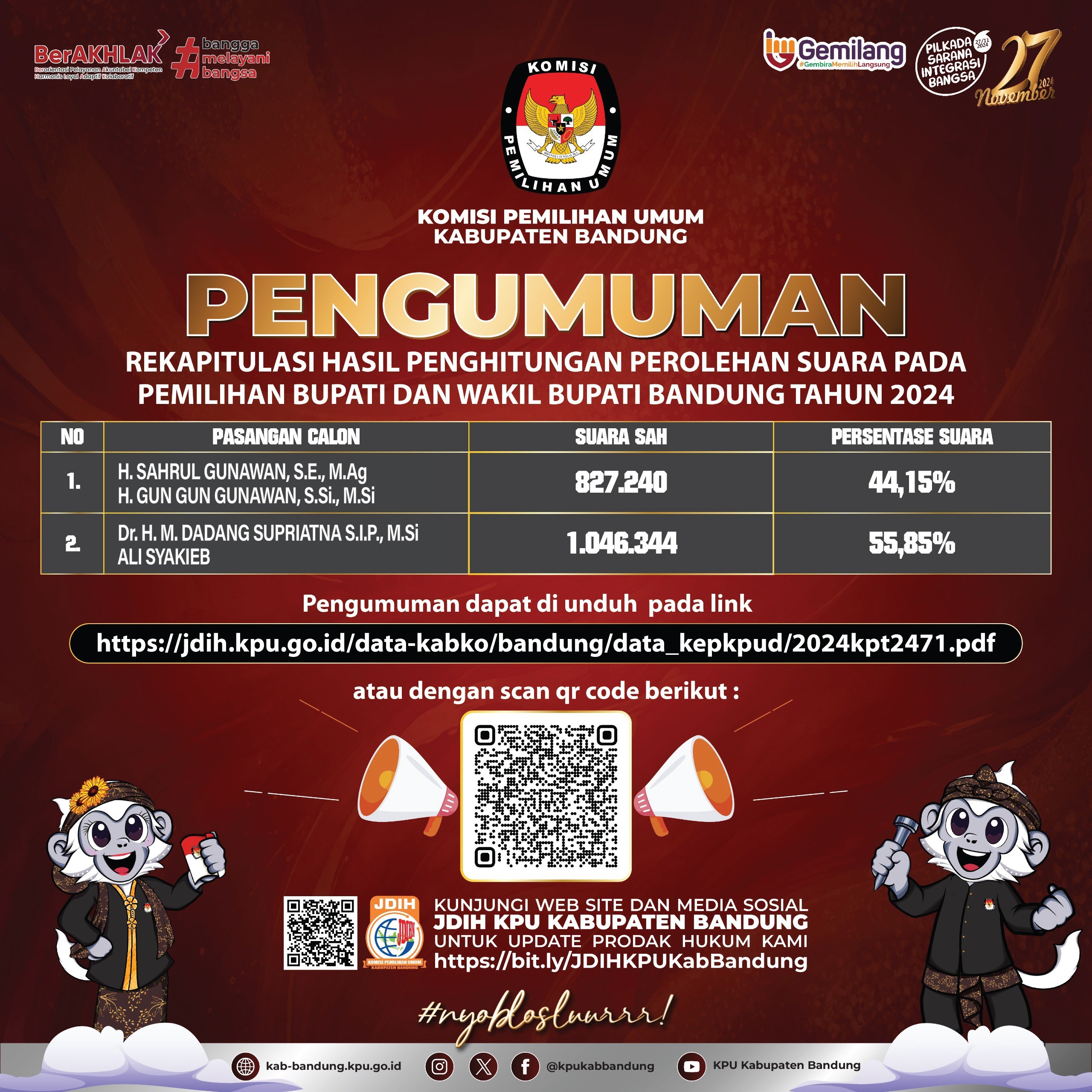 PENGUMUMAN REKAPITULASI HASIL PENGHITUNGAN PEROLEHAN SUARA PADA PEMILIHAN BUPATI DAN WAKIL BUPATI BANDUNG TAHUN 2024
