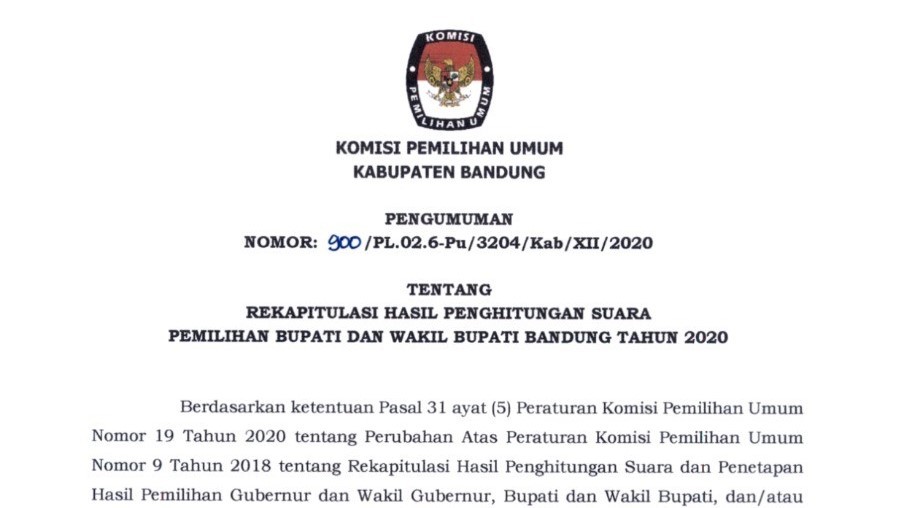 Pengumuman serta Salinan Keputusan tentang Rekapitulasi Hasil Penghitungan Suara Pemilihan Bupati dan Wakil Bupati Bandung Tahun 2020, selengkapnya dapat DIUNDUH DI SINI
