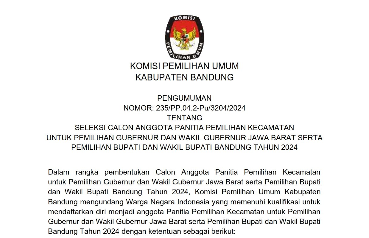 PENGUMUMAN SELEKSI CALON ANGGOTA PANITIA PEMILIHAN KECAMATAN UNTUK PILGUB JAWA BARAT SERTA PILBUP BANDUNG THN 2024