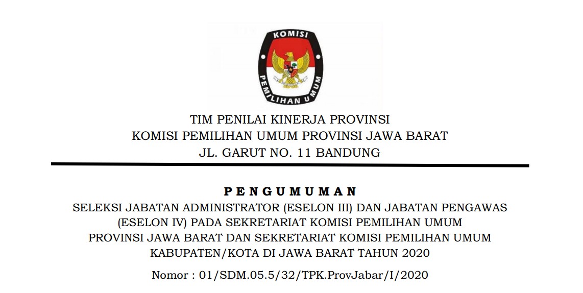Pengumuman tentang seleksi jabatan administrator (Eselon III) dan jabatan pengawas (Eselon IV) pada Sekretariat KPU Provinsi Jawa Barat dan Sekretariat KPU Kabupaten/Kota di Jawa Barat Tahun 2020, selengkapnya dapat DIUNDUH DI SINI.