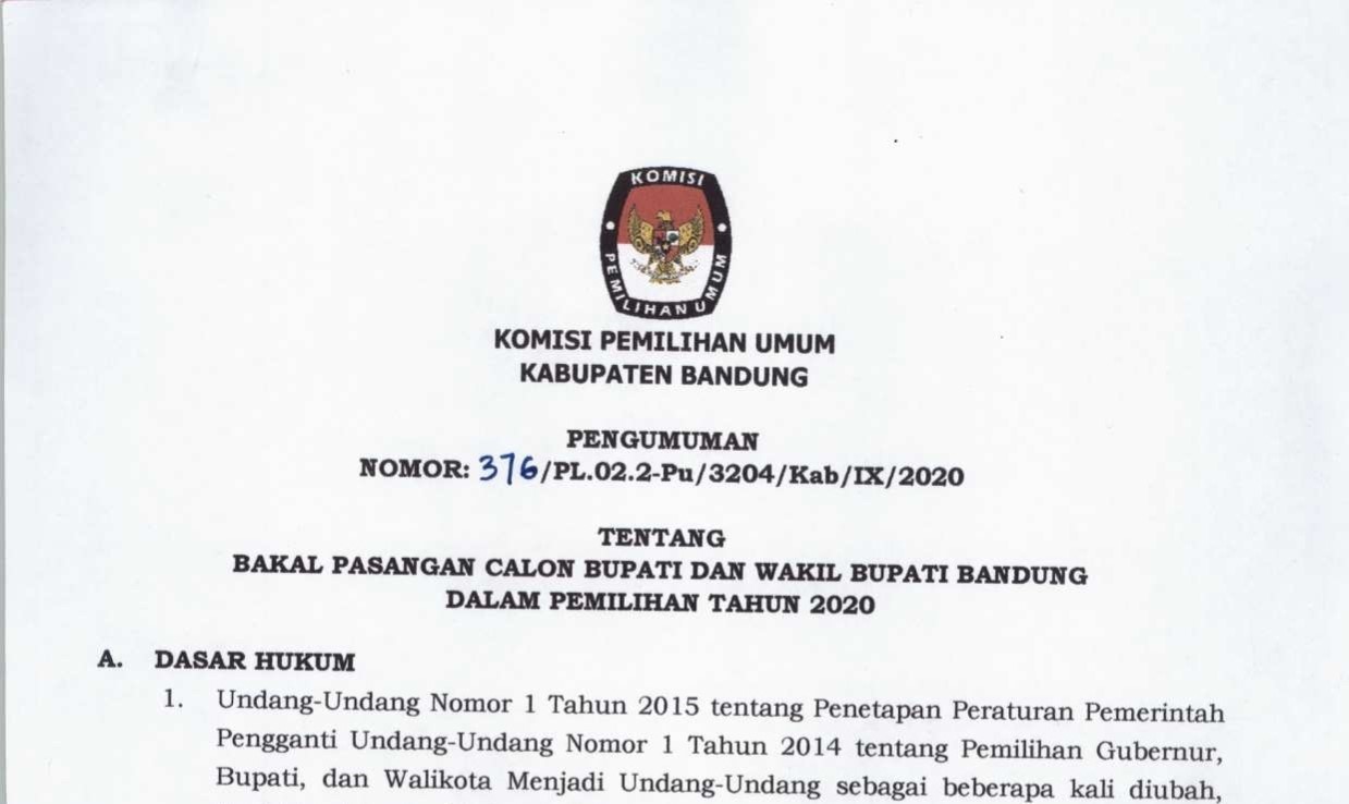 Pengumuman tentang Bakal Pasangan Calon Bupati dan Wakil Bupati Bandung dalam Pemilihan Tahun 2020 beserta Dokoumen Pendukungnya, selengkapnya dapat DIUNDUH DI SINI