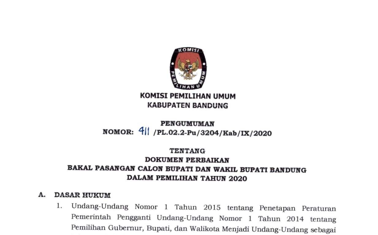 Pengumuman tentang Dokumen Perbaikan Bakal Pasangan Calon Bupati dan Wakil Bupati Bandung dalam Pemilihan Tahun 2020 beserta Dokoumen Pendukungnya, selengkapnya dapat DIUNDUH DI SINI