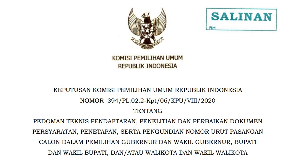 Pengumuman tentang Pedoman Teknis Pendaftaran, Penelitian dan Perbaikan Dokumen Persyaratan, Penetapan, serta Pengundian Nomor Urut Pasangan Calon dalam Pemilihan Tahun 2020, selengkapnya dapat DIUNDUH DI SINI.