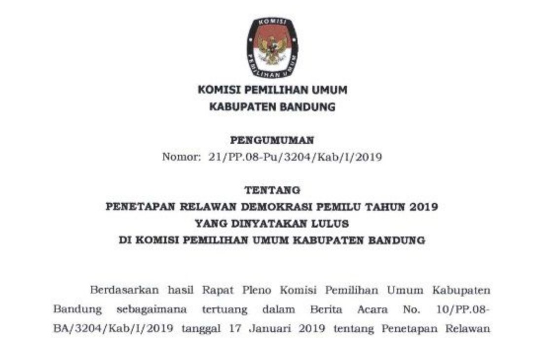 Pengumuman tentang penetapan Relawan Demokrasi pada Pemilu Tahun 2019 yang dinyatakan lulus, selengkapnya dapat DIUNDUH DI SINI.