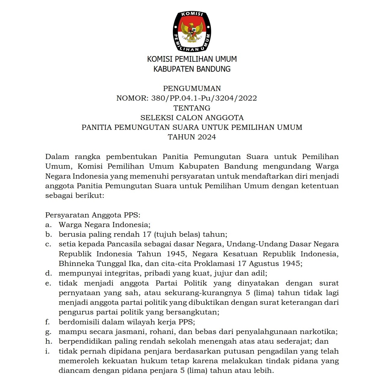 PENGUMUMAN TENTANG SELEKSI CALON AGGOTA PPS UNTUK PEMILIHAN UMUM TAHUN 2024