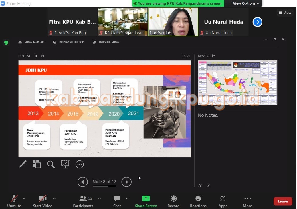 Bandung, kab-bandung.kpu.go.id – KPU Kabupaten Bandung, bergabung secara daring dalam kegiatan Penyuluhan Hukum Kepemiluan kepada Tokoh Masyarakat, sekaligus launching Perpustakaan dan Taman Baca Demokrasi serta Launching Kegiatan Mengkaji Hukum (MH) Kepemiluan Jaringan Dokumentasi dan Informasi Hukum (JDIH) KPU Kabupaten Pangandaran. Menghadirkan Kepala Biro Perundang-undangan KPU RI, Nur Syarifah sebagai Key note speech, Anggota Bawaslu Kabupaten Pangandaran Nur Syaefful Rokhmat, Dosen UIN Sunan Gunung Jati Bandung Uu Nurul Huda, Anggota KPU Provinsi Jawa Barat Reza Alwan Sovnidar serta Ketua KPU Kabupaten Pangandaran Muhtadi yang turut memberikan sambutan pada kegiatan ini. Jumat (3 Juni 2022).