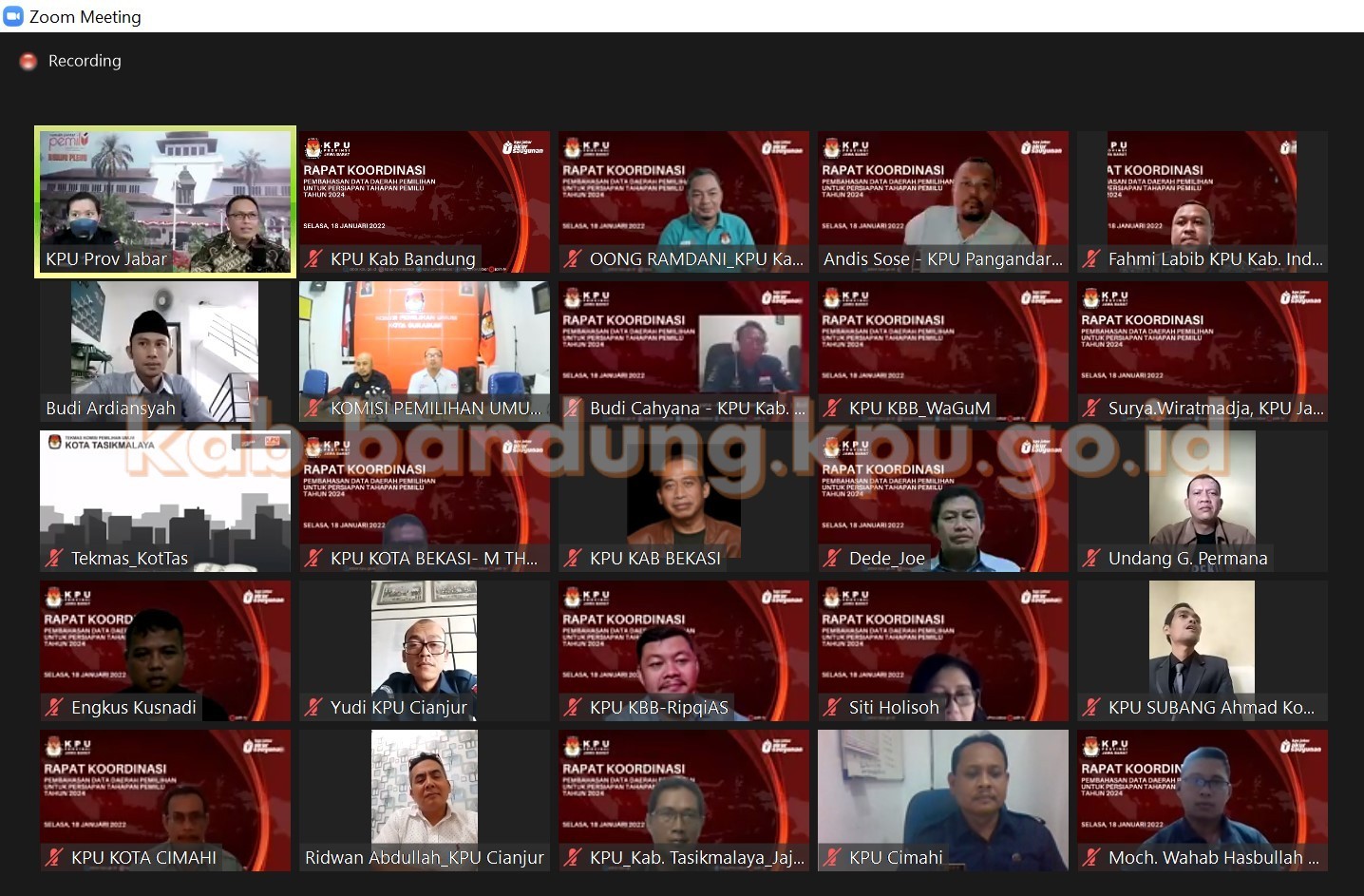 Bandung, kab-bandung.kpu.go.id – Menjelang penyelenggaraan tahapan Pemilu Tahun 2024 yang akan dilaksanakan beberapa waktu ke depan, KPU Provinsi Jawa Barat mengadakan rapat koordinasi secara daring bersama KPU Kabupaten/Kota. Rapat koordinasi tersebut mengusung tema Pembahasan Data Daerah Pemilihan (Dapil) untuk Persiapan Tahapan Pemilu Tahun 2024, yang dilaksanakan pada hari Selasa, 18 Januari 2022. Kegiatan ini dipimpin oleh Anggota KPU Provinsi Jawa Barat, Endun Abdul Haq, dan diikuti oleh Anggota Divisi Teknis Penyelenggaraan di masing-masing satuan kerja se-Jawa Barat.