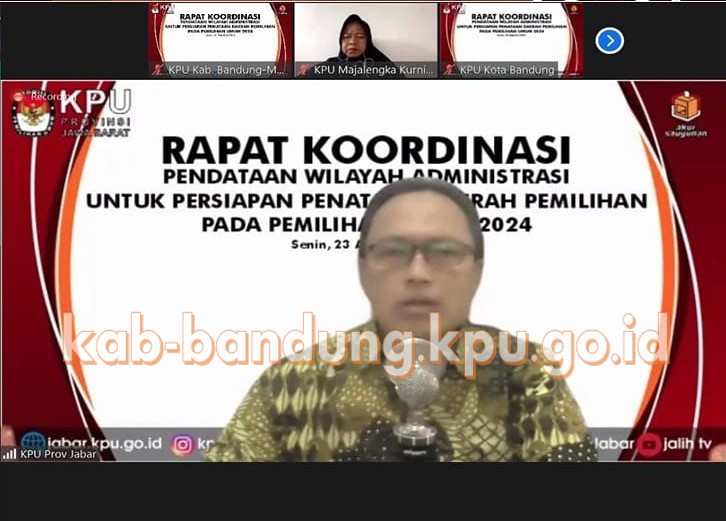 Bandung, kab-bandung.kpu.go.id – KPU Provinsi Jawa Barat menyelenggarakan rapat koordinasi tentang Pendataan Wilayah Administrasi untuk Persiapan Penataan Daerah Pemilihan pada Pemilihan Umum Tahun 2024, Senin (23 Agustus 2021) bersama KPU Kabupaten/Kota se-Jawa Barat yang dilakukan secara daring. Ketua KPU Provinsi Jawa Barat, Rifqi Ali Mubarak, dalam sambutannya menyampaikan sesuai arahan KPU Republik Indonesia, agar kita mulai untuk melakukan penyusunan Daerah Pemilihan (Dapil), salah satu tahapan pelaksanaan Pemilu Tahun 2024 yang paling awal adalah penyusunan dan penetapan Dapil. Jika Pemilu dilaksanakan bulan Februari 2024, maka tahapan untuk melakukan penyusunan Dapil dilaksanakan di bulan Oktober 2022.