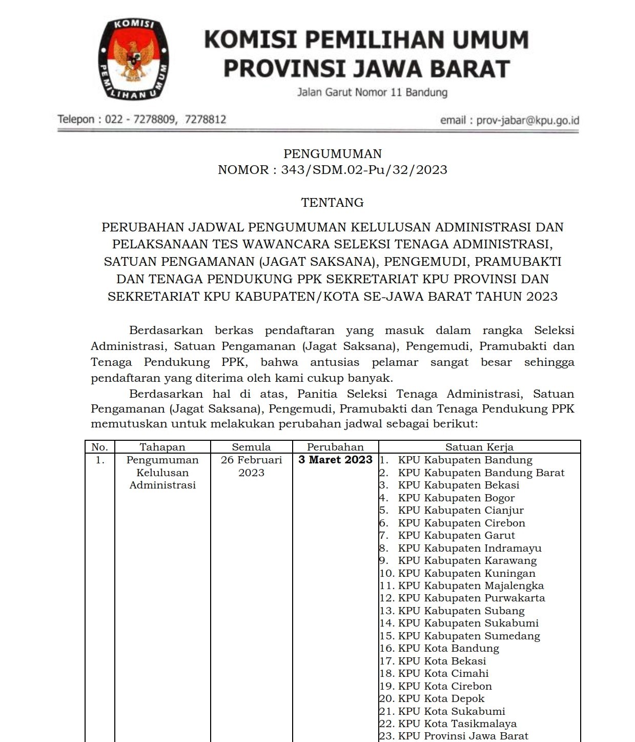 PERUBAHAN JADWAL PENGUMUMAN KELULUSAN ADMINISTRASI DAN PELAKSANAAN TES WAWANCARA SELEKSI TENAGA ADMINISTRASI, SATUAN PENGAMANAN (JAGAT SAKSANA), PENGEMUDI, PRAMUBAKTI DAN TENAGA PENDUKUNG PPK SEKRETARIAT KPU PROVINSI DAN SEKRETARIAT KPU KABUPATEN/KOTA SE-JAWA BARAT TAHUN 2023, SELENGKAPNYA DAPAT DIUNDUH DISINI