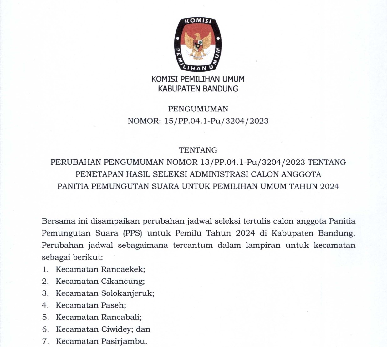 PERUBAHAN PENGUMUMAN NOMOR 13/PP.04.1-Pu/3204/2023 TENTANG PENETAPAN HASIL SELEKSI ADMINISTRASI CALON ANGGOTA PPS PADA PEMILU TAHUN 2024