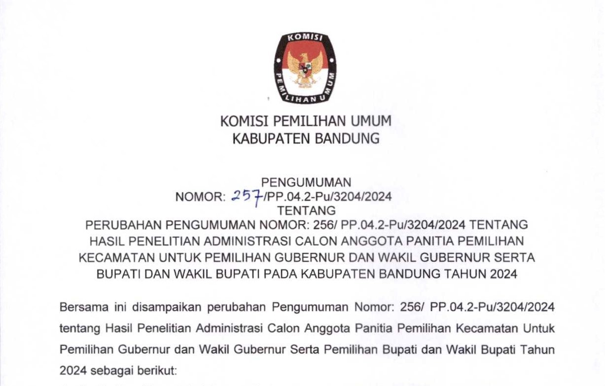 Bersama ini disampaikan Perubahan Pengumuman Nomor: 256/ PP.04.2-Pu/3204/2024 tentang Hasil Penelitian Administrasi Calon Anggota Panitia Pemilihan Kecamatan Untuk Pemilihan Gubernur dan Wakil Gubernur Serta Pemilihan Bupati dan Wakil Bupati Tahun 2024. Hasil Penelitian Administrasi Calon Anggota Panitia Pemilihan Kecamatan untuk Pemilihan Gubernur dan Wakil Gubernur serta Pemilihan Bupati dan Wakil Bupati adalah 698 (Enam Ratus Sembilan Puluh Delapan) orang yang dinyatakan Memenuhi Syarat dan 141 (Seratus Empat Puluh Satu) orang yang dinyatakan Tidak Memenuhi Syarat, sebagaimana data terlampir.