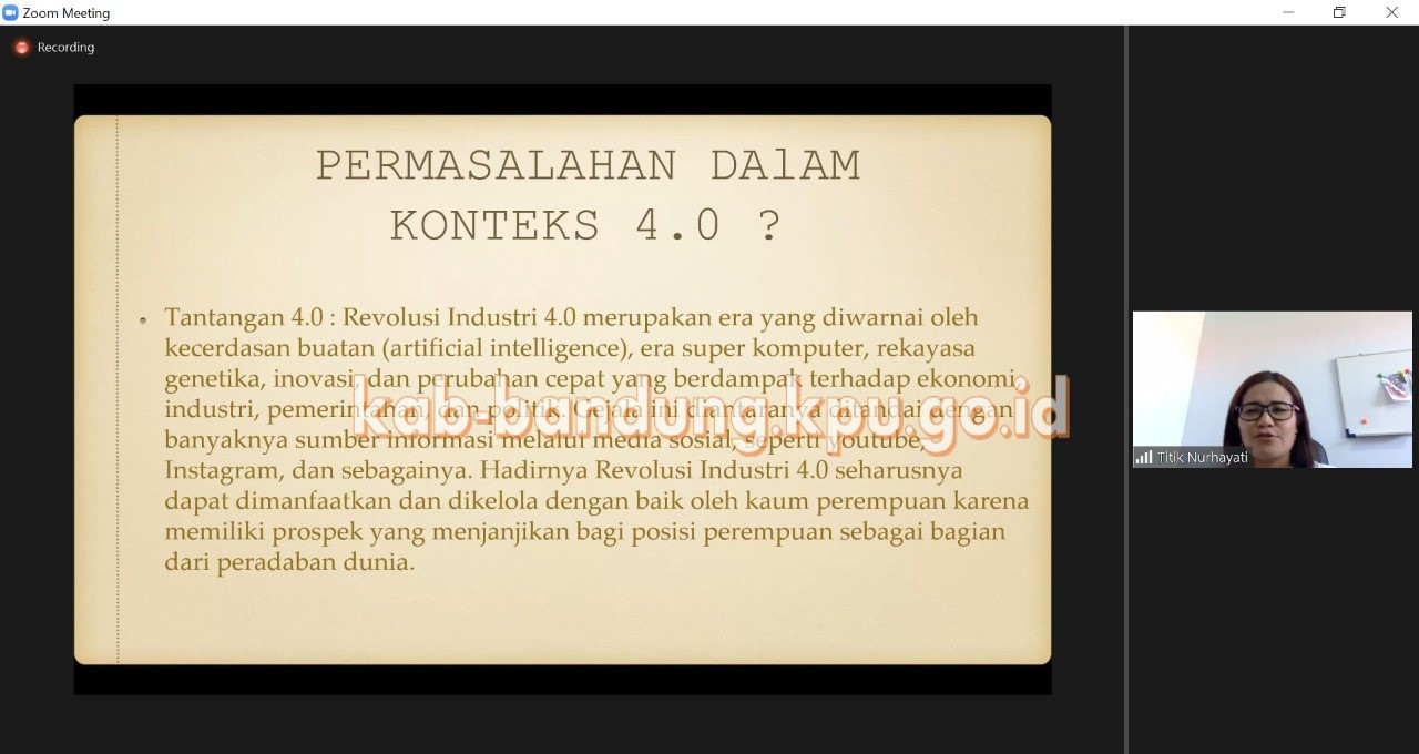 Bandung, kab-bandung.kpu.go.id – Komisi Pemilihan Umum (KPU) Kabupaten Bandung mengikuti Webinar Ngaji Demokrasi dimasa Covid-19 (Ngademi) dengan tema “Politik Perempuan dan Tantangan Pemilu 2024” yang diselenggarakan oleh KPU Kabupaten Cirebon. Narasumber pada acara ini terdiri dari: (1) Prof. Dr. Nurliah Nurdin, MA., Direktur Politeknik STIA LAN Jakarta; (2) Titik Nurhayati, S.Pd., M.Hum., Anggota KPU Provinsi Jawa Barat; (3) Dahliah Umar, MA., Ketua Network for Indonesian Democratic Society Netfid Indonesia; serta (4) Siska Karina, S.H., M.H., Ketua Komisi IV DPRD Kabupaten Cirebon, Selasa (21/04/2021).
