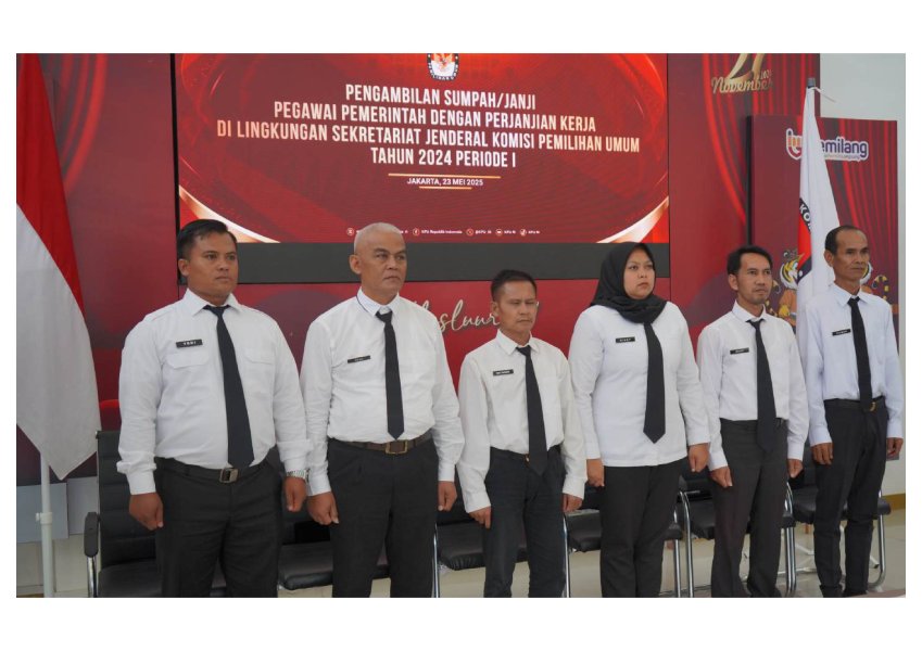 Bandung, kab-bandung.kpu.go.id – Sebanyak 6 (enam) orang Pegawai Pemerintah dengan Perjanjian Kerja (PPPK) Pada Sekretariat KPU Kabupaten Bandung mengikuti pengambilan sumpah/janji yang dilaksanakan secara daring pada Jum’at (23/5/2025). Pengambilan sumpah/janji dipimpin langsung oleh Sekretaris Jenderal KPU Bernad Dermawan Sutrisno bersama dengan 3.486 orang PPPK KPU se-Indonesia yang dilaksanakan di masing-masing wilayahnya.