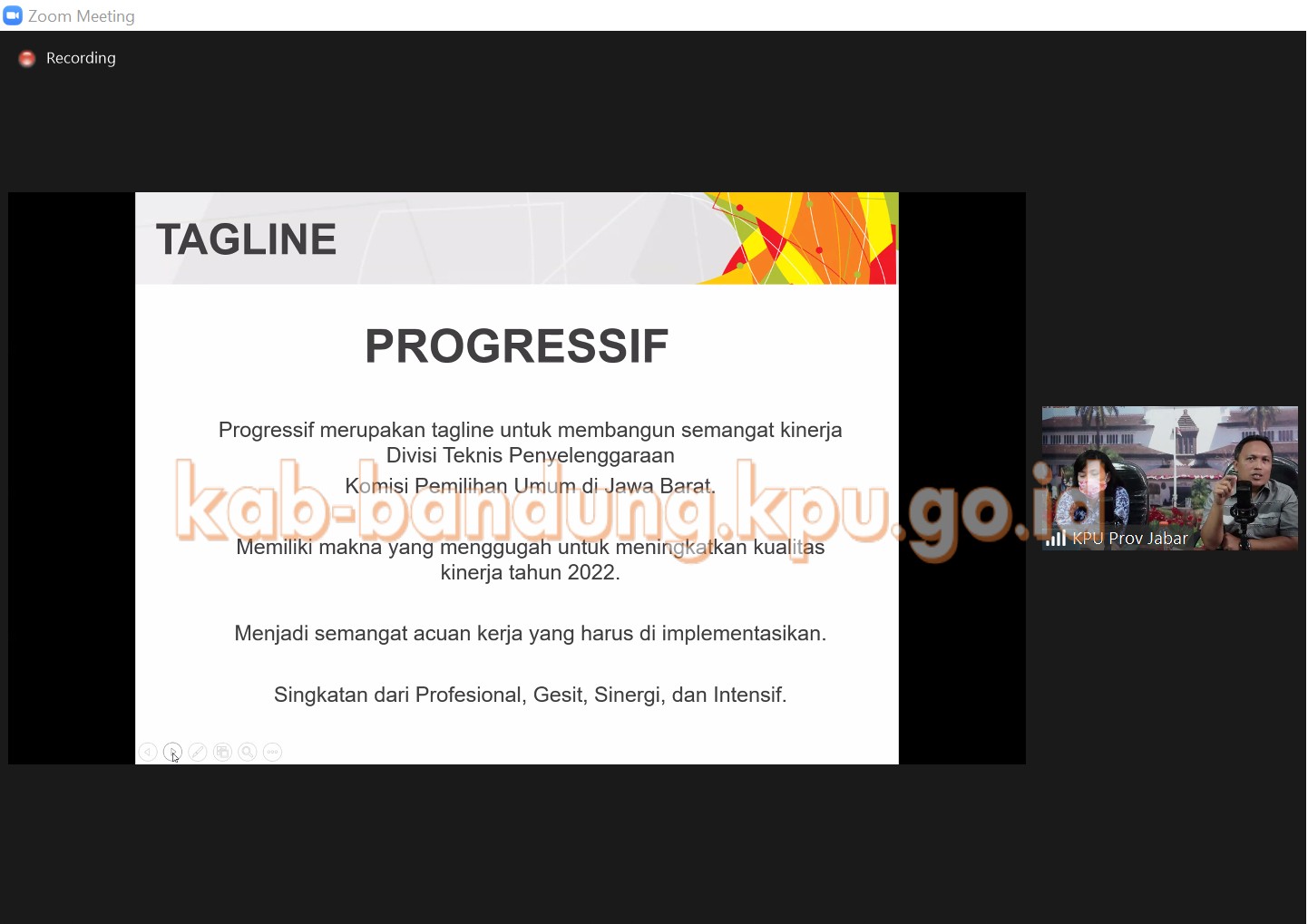 PROGRESSIF (Profesional, Gesit, Sinergi dan Intensif) merupakan tagline Divisi Teknis Penyelenggaraan se-Jawa Barat di tahun 2022 ini. Tagline ini dibuat untuk membangun semangat kinerja divisi teknis penyelenggara KPU se Jawa Barat, progressif memiliki makna yang menggugah untuk meningkatkan kualitas kinerja KPU di tahun 2022 berdasarkan evaluasi yang telah dilakukan sebelumnya dan dapat menjadi semangat acuan kerja yang harus diimplementasikan. Profesional dimaknai sebagai semangat kerja yang dibangun oleh setiap satuan kerja KPU, yang memiliki arti bahwa KPU harus menjalankan seluruh tugas dan tanggungjawab sesuai dengan etika yang berlaku. Dalam membangun profesional setiap individu harus memiliki knowledge and skill (pengetahuan dan kemampuan) terkait tugas teknis. Istilah lain yang menggambarkan professional adalah “The Right Man on The Right Place”. Gesit, dimaknai sebagai kesigapan individu dalam bekerja, dapat memberikan excellent service kepada para pemangku kepentingan, sebagai individu yang bekerja di Komisi Pemilihan Umum sikap-sikap tersebut harus dimiliki untuk menanggapi setiap tugas yang diberikan dan memberikan pelayanan yang terbaik. Sinergi, merupakan gabungan dari kerjasama yang baik, baik secara internal maupun dengan eksternal dan dapat membangun komunikasi yang baik dan saling melengkapi kinerja. Intensif, dalam konteks ini yaitu melakukan peran-peran dengan kesungguhan untuk mendapatkan hasil yang optimal sesuai tujuan yang akan dicapai, sehingga kesungguhan dalam bekerja akan meningkatkan kualitas dan produktifitas kerja, papar Endun. (Humas KPU Kabupaten Bandung).