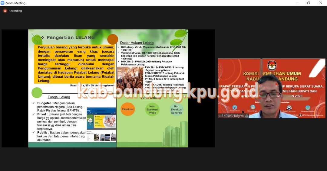 KPU Kabupaten Bandung menghadirkan Kasi Pelayanan Lelang Kantor Pelayanan Kekayaan Negara dan Lelang (KPKNL) Bandung 1, Wasis Winarto, selaku narasumber. Diharapkan dengan kegiatan ini kita semua dapat melaksanakan penghapusan dan lelang barang milik negara (BMN) sesuai dengan peraturan dan kaidah-kaidah yang berlaku. Saya berharap kegiatan ini berjalan lancar dan paparan dari KPKNL akan memberikan bekal kepada kita yang ilmu-ilmunya bisa kita terapkan, tambah Wasis.