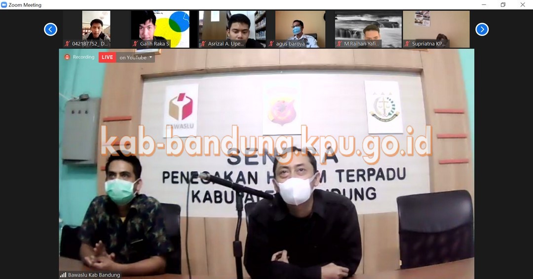 Yusuf Kurnia menyampaikan pendapatnya, Pilkada 2020 telah diselenggarakan di masa pandemi Covid-19, kemudian dilakukan modifikasi secara teknis melalui peraturan-peraturan, baik untuk Bawaslu maupun KPU. Dalam konteks penanganan pelanggaran, Bawaslu telah menyediakan perangkat adanya pelaporan secara online, tetapi respon peserta lebih suka melakukan pelaporan secara langsung dengan datang ke kantor. Begitu juga dengan Sistem Informasi Rekapitulasi (SIREKAP) yang mengalami beberapa problem. Namun di tengah keterbatasan dan tantangan-tantangan ini, Bawaslu telah secara maksimal melakukan pengawasan termasuk penindakan terhadap kecurangan-kecurangan pilkada. Dipandu moderator Anggota KPU Bawaslu Kabupaten Bandung, Hedi Ardia, menyampaikan hasil pengawasan pada Pilkada 2020 di Kabupaten Bandung kemarin, ada 103 pelanggaran protokol kesehatan, 7 pelanggaran kode etik penyelenggara, 2 intimidasi kepada Penyelenggara Pemilu, 1 penggunaan fasilitasi pemerintah, 23.746 pelanggaran alat peraga kampanye, 10 pelanggaran politik uang, 30 pelanggaran netralitas ASN, dan 2 pelanggaran netralitas Kepala Desa.