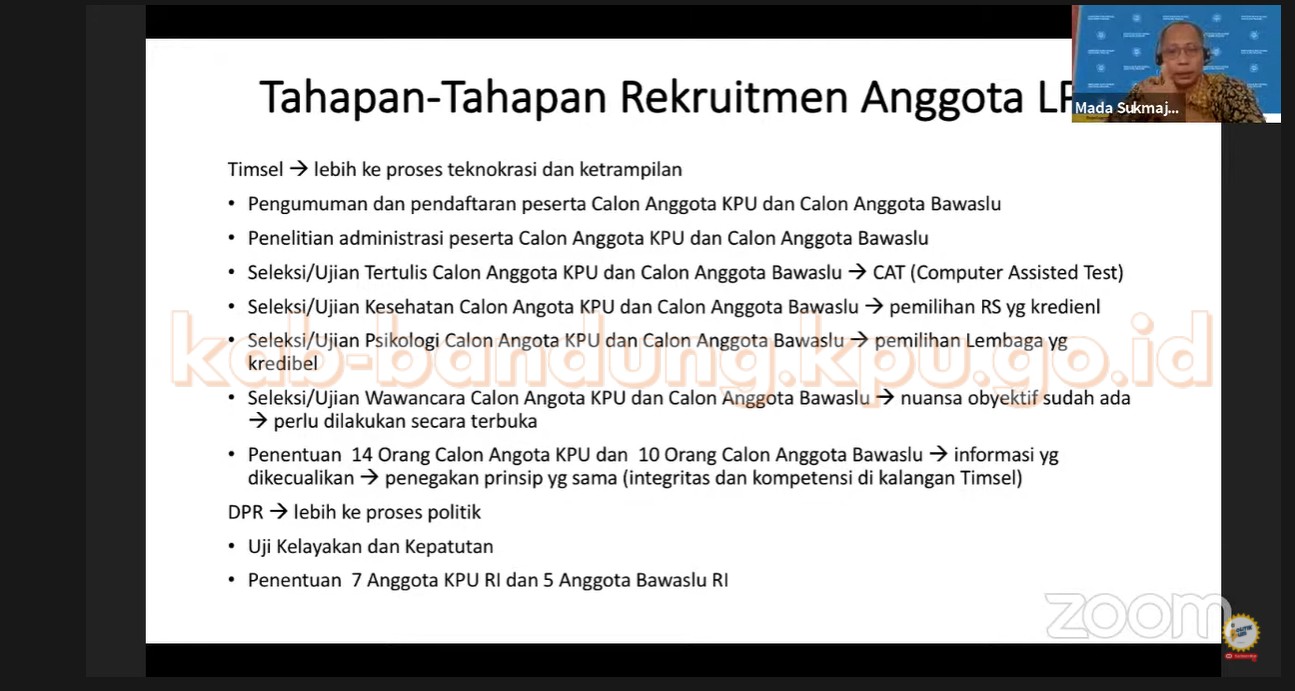 Bandung, kab-bandung.kpu.go.id – Senin (04 Oktober 2021), Ditjen Politik dan Pemerintahan Umum Kemendagri mengadakan webinar terkait Seleksi Calon Anggota KPU RI dan Bawaslu RI Periode 2022-2027. Webinar dibuka oleh Dirjen Politik dan PUM Kemendagri, Bahtiar, yang menyampaikan bahwa sebagaimana diatur dalam Undang-Undang Nomor 17 Tahun 2017 tentang Pemilihan Umum, bahwa persiapan penyelenggaraan seleksi harus disusun paling lambat enam bulan sebelum berakhirnya jabatan penyelenggara pemilu, dalam hal ini Anggota KPU RI dan Bawaslu RI periode 2017-2022 yang akan berakhir pada bulan April 2022. Sehingga pada pertengahan bulan Oktober ini persiapan harus sudah dilaksanakan, dan Tim Seleksi harus sudah dibentuk. Tim seleksi sendiri, sesuai Undang-Undang Nomor 17 Tahun 2017 berjumlah paling banyak 11 orang dengan memerhatikan keterwakilan perempuan paling sedikit 30%. Bahtiar menambahkan, calon peserta anggota KPU RI dan Bawaslu RI yang akan mendaftar diharapkan memahami betul apa saja tugas pokok dan syarat sebelum mendaftar. Seleksi calon anggota KPU RI dan Bawaslu RI memalui beberapa tahapan seleksi yaitu: (1) Pendaftaran, yang diumumkan melalui media massa nasional; (2) Seleksi Administrasi; (3) Tes Tertulis; (4) Tes Psikologi; (5) Tes Kesehatan; dan (5) Tes Wawancara. Hasil dari seleksi ini menghasilkan dua kali calon anggota dan dilaporkan kepada presiden, kemudian diteruskan ke DPR RI untuk dilakukan uji kepatutan dan kelayakan, yang selanjutnya menyampaikan nama-nama terpilih kepada presiden untuk dilantik.
