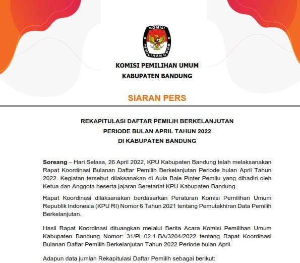 Siaran Pers Rekapitulasi Daftar Pemilih Berkelanjutan (DPB) Periode Bulan April Tahun 2022 di Tingkat Kabupaten Bandung, selengkapnya dapat DIUNDUH DI SINI
