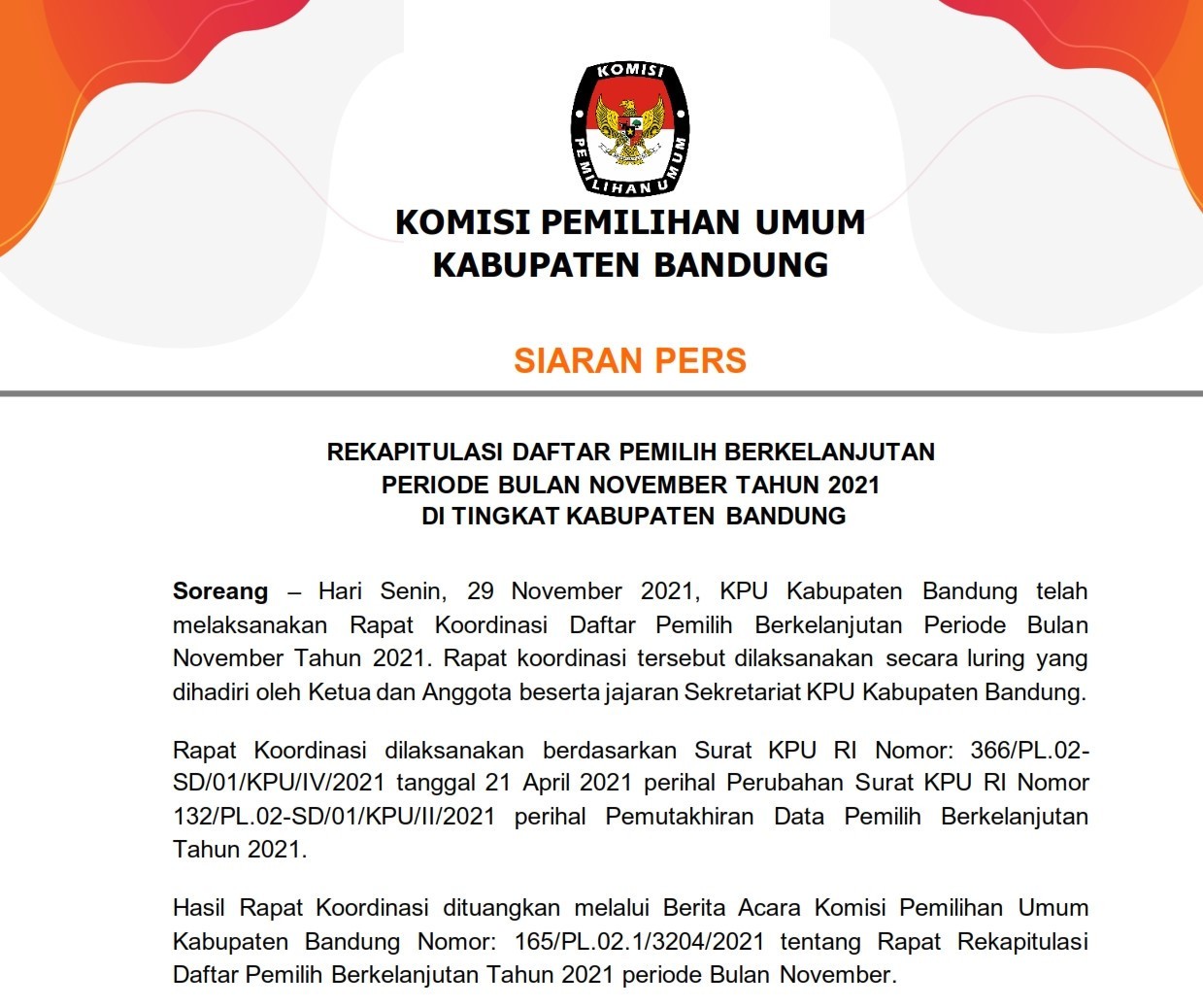 Siaran Pers Rekapitulasi Daftar Pemilih Berkelanjutan (DPB) Periode Bulan November Tahun 2021 di Tingkat Kabupaten Bandung, selengkapnya dapat DIUNDUH DI SINI