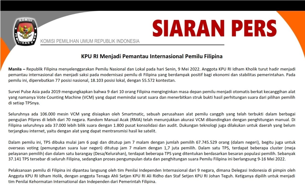 SIARAN PERS: KPU RI MENJADI PEMANTAU INTERNASIONAL PEMILU FILIPINA