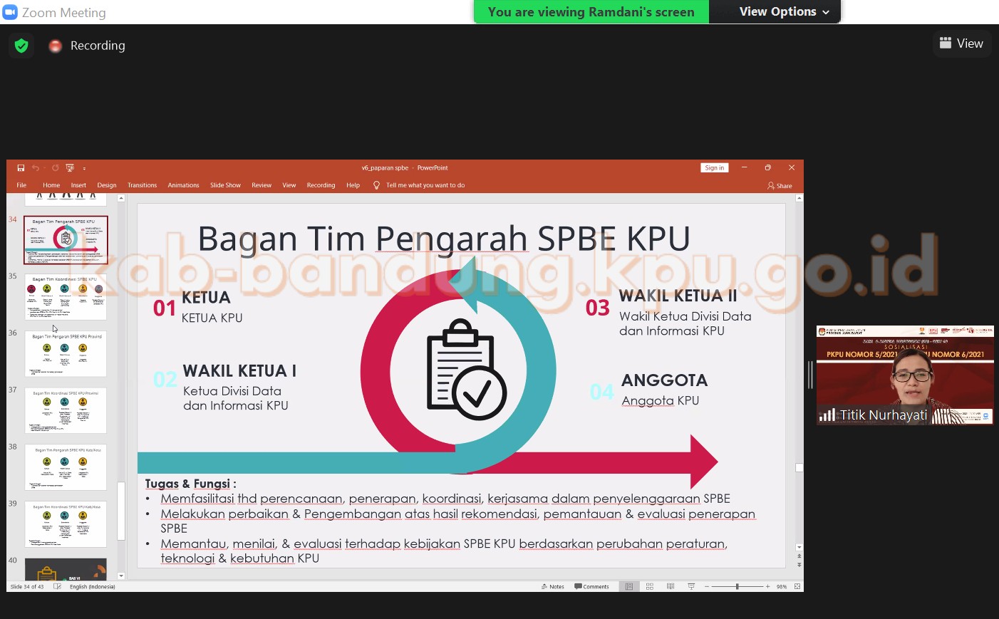 Bandung, kab-bandung.kpu.go.id – KPU Provinsi Jawa Barat mengadakan sosialisasi Peraturan KPU Nomor 5 Tahun 2021 tentang Penyelenggaraan Sistem Pemerintahan Berbasis Elektronik (SPBE) dan Peraturan KPU Nomor 6 Tahun 2021 tentang Pemutakhiran Data Pemilih Berkelanjutan. Kegiatan tersebut dikemas dalam acara Webinar Data dan Digital Discussion (3D) yang telah memasuki seri ke-13 pada Rabu (8/12/2021). Ketua Divisi Data dan Informasi KPU Provinsi Jawa Barat, Titik Nurhayati, menjadi pemateri utama dalam kegiatan ini.