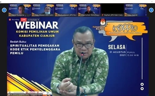 Bandung, kab-bandung.kpu.go.id – KPU Kabupaten Cianjur mengadakan webinar bedah buku pada Selasa (31 Agustus 2021) dengan tema Spiritualitas Penegakan Kode Etik Pemilu, yang mana tema ini diangkat dari Judul Buku karya Arif Ma’ruf Suha, S.AG.,M.AP. Kode Etik sudah menjadi norma secara tertulis dan tertuang dalam peraturan Dewan Kehormatan Penyelenggara Pemilu (DKPP) yang menjadi pedoman bagi penyelenggara pemilu. Buku ini membedah bukan hanya soal panduan pelaksanaan bagi penyelenggara, tetapi lebih dalam secara spiritualitas. Ujar Hadi Dzikri Nur selaku Anggota Bawaslu Kabupaten Cianjur yang bertindak sebagai Moderator.