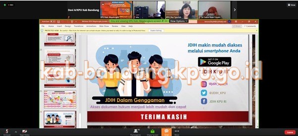 Bandung, kab-bandung.kpu.go.id – Selasa (27/4/2021) Komisi Pemilihan Umum (KPU) Kabupaten Bandung mengikuti Webinar SiGincu yang diselenggarakan oleh KPU Kabupaten Majalengka dengan topik "Strategi Membangun JDIH yang Berkualitas dan Aksesibel". Narasumber pada acara ini terdiri dari: (1) I Dewa Kade Wiarsa Raka Sandi, ST., SH., M.Si., Anggota KPU Republik Indonesia; (2) Nur Syarifah, SH., LLM., Kepala Biro Hukum Sekretariat Jenderal KPU Republik Indonesia; (3) Reza Alwan Sovnidar, SH., Anggota KPU Provinsi Jawa Barat Divisi Hukum dan Pengawasan; serta (4). Suwardi Maninggesa, S.H.I., Anggota KPU Kabupaten Pangandaran Divisi Hukum dan Pengawasan.