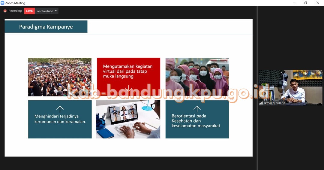 Bandung, kab-bandung.kpu.go.id – Komisi Pemilihan Umum (KPU) Provinsi Jawa Barat kembali melaksanakan Diskusi Daring Reguler dengan tema Kampanye Pemilihan Berintegritas, Selasa (4/5/2021). Narasumber pada kegiatan ini diisi oleh Ikmal Maulana, Anggota KPU Kabupaten Karawang Divisi Sosdiklih dan Parmas serta Maskuri Sudrajat, Anggota KPU Kabupaten Pangandaran Divisi Sosdiklih dan Parmas.