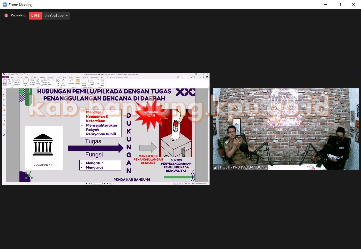 Wakil Bupati Bandung, Sahrul Gunawan, SE turut hadir menjadi narasumber pada kesempatan kali ini. Metode Identifikasi dan Kriteria Daerah Rawan Bencana Alam menjadi subtema yang diangkat dalam diskusi. Manajemen penanggulangan bencana yang dilakukan Pemerintah Daerah (Pemda) merupakan salah satu bentuk dukungan dan tugas serta strategi dalam menyukseskan penyelenggaraan pemilu/pemilihan di Kabupaten Bandung. Kegiatan penanggulangan bencana ini diakomodir oleh Badan Penaggulangan Bencana Daerah (BPBD) meliputi Pencegahan (prevention), Mitigasi (mitigation), Kesiapsiagaan (preparedness), Peringatan Dini (early warning), Tanggap Darurat (response), Bantuan Darurat (relief), Pemulihan (recovery), Rehablitasi (rehabilitation), dan Rekonstruksi (reconstruction).