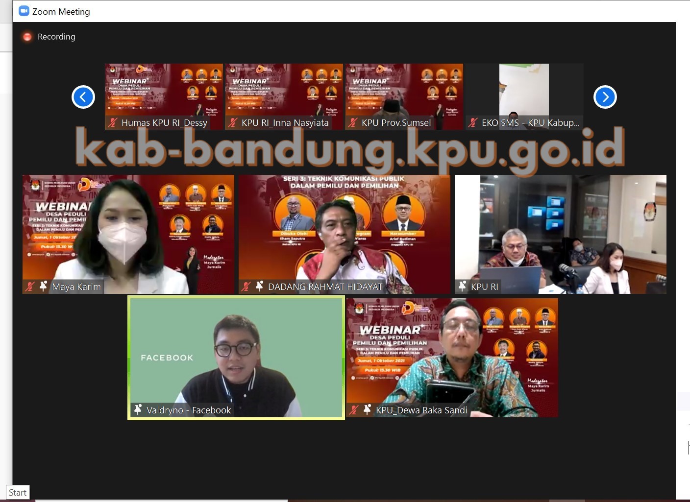 Bandung, kab-bandung.kpu.go.id – KPU RI Kembali menggelar kegiatan Webinar Desa Peduli Pemilu dan Pemilihan (DP3) yang dilaksanakan pada Jumat (1/10/2021). Dalam Seri III kali ini mengambil tema Teknik Komunikasi Publik dalam Pemilu dan Pemilihan. Ketua KPU RI, Ilham Saputra, membuka acara ini dengan menyampaikan bahwa dalam program DP3 diperlukan skills dan teknik komunikasi dalam pemilu dan pemilihan ketika pertemuan-pertemuan dengan stakeholders, kader DP3 maupun dengan masyarakat. Komunikasi tidak hanya sekedar menyampaikan, tetapi juga memastikan publik untuk dapat memahami. Diharapkan dengan teknik komunikasi yang baik dapat meningkatkan partisipasi masyarakat dalam seluruh tahapan pemilu dengan posisi masing-masing. KPU harus bergerak dalam membangun literasi digital dan pengelolaan media sosial dalam komunikasi kepemiluan, khususnya kepada masyarakat pedesaan. KPU sudah menyusun strategi Badan Koordinasi Hubungan Masyarakat (Bakohumas) dalam menghadapi Pemilu dan Pemilihan Tahun 2024. Hal ini perlu dilakukan sejak dini agar Bakohumas KPU kuat dan memiliki kompetensi dalam memberikan pelayanan informasi yang optimal dan bertanggungjawab serta memberikan pertimbangan arus informasi dari dan kepada masyarakat. Ilham berharap dengan menghadirkan narasumber dibidangnya dapat memperkaya sudut pandang KPU sebagai penyelenggara terkait komunikasi publik menyongsong Pemilu dan Pemilihan Tahun 2024.
