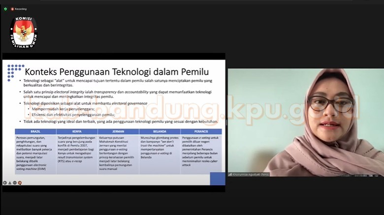 Direktur Eksekutif Perludem, Khoirunisa Agustyati, mengutarakan saat ini teknologi digunakan sebagai “alat” untuk mencapai tujuan tertentu dalam pemilu, salah satunya menciptakan pemilu yang berkualitas dan berintegritas. Dengan teknologi, masyarakat menjadi lebih percaya terhadap proses dan hasil pemilu, sehingga diharapkan teknologi dapat mempermudah kerja penyelenggara dan membuat penyelenggaraan pemilu menjadi efektif dan efisien. Namun demikian tidak ada teknologi yang ideal dan terbaik, yang ada ialah penggunaan teknologi pemilu yang sesuai dengan kebutuhan. Terdapat beberapa prinsip penerapan teknologi dalam Pemilu menurut ACE Project, diantaranya penilaian yang menyeluruh terhadap kemajuan teknologi, mempertimbangkan dampak dari penerapan teknologi, menjaga transparansi dan etika, memastikan dan memperhatikan keamanan teknologi, mencoba akurasi data yang dihasilkan, memastikan keberhasilan, serta memastikan inklusifitas.