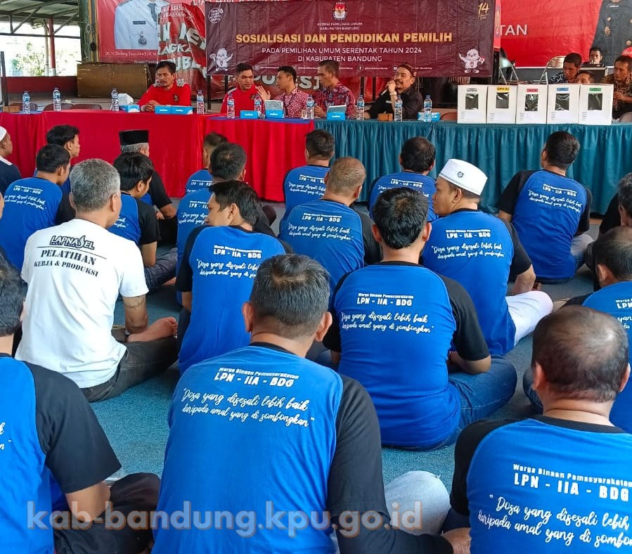 Bandung, kab-bandung.kpu.go.id – Dalam rangka meningkatkan partisipasi masyarakat pada Pemilu Tahun 2024, KPU Kabupaten Bandung menyelenggarakan kegiatan Sosialisasi dan Pendidikan Pemilih bertempat di Lapas Narkotika Kelas IIA Bandung, kecamatan Baleendah Kabupaten Bandung pada Jumat (25/8/23). Kegiatan ini diikuti oleh perwakilan warga binaan Lapas Narkotika Kelas IIA Bandung, sebanyak 65 (enam puluh lima) peserta hadir mengikuti kegiatan sosialisasi yang disampaikan oleh KPU Kabupaten Bandung.