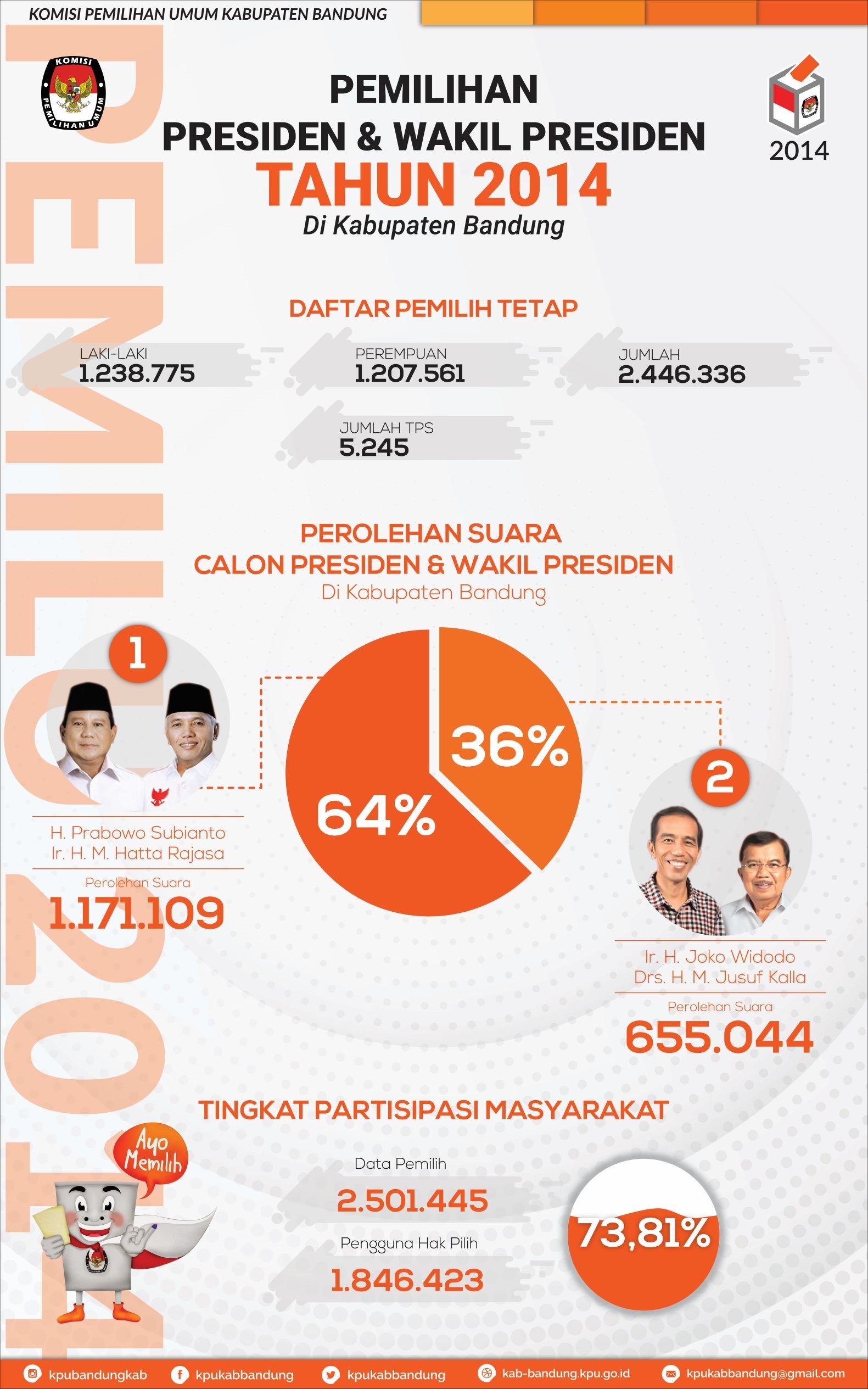 Pemilu Legislatif Tahun 2014 diikuti oleh 15 Partai Politik dan 36 Calon Anggota DPD untuk kuota di Provinsi Jawa Barat. Pemilu Presiden dan Wakil Presiden (Pilpres) Tahun 2014 diselenggarakan dengan ketentuan Pasangan Calon yang memperoleh suara lebih dari 50% ditetapkan sebagai pemenang. Persyaratan untuk dapat mengusulkan Pasangan Calon adalah diusung oleh Parpol/Gabungan Parpol minimal memperoleh 20% dari kursi DPR atau 25% suara sah. Pilpres diikuti oleh 2 Pasangan Calon, yang terdiri dari: (1) Prabowo Subianto dan Hatta Rajasa yang diusung oleh Partai Golongan Karya (Golkar), Partai Gerakan Indonesia Raya (Gerindra), Partai Amanat Nasional (PAN), Partai Keadilan Sejahtera (PKS), Partai Persatuan Pembangunan (PPP), dan Partai Bulan Bintang (PBB); serta (2) Joko Widodo dan Muhammad Jusuf Kalla yang diusung oleh Partai Demokrasi Indonesia Perjuangan (PDI Perjuangan), Partai Kebangkitan Bangsa (PKB), Partasi Nasdem (Nasional Demokrat), dan Partai Hati Nurani Rakyat (Hanura).